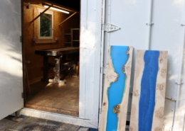 Wir verarbeiten Massivholz, das im normalen Handwerk keine Verwendung findet, da es Risse, Löcher und Äste hat oder einfach „krumm und schief“ ist. Das Holz definiert also die Maße des Tisches. Diese Vollholzbohlen aus heimischen Bäumen ergänzen und vervollständigen wir mit Epoxidharz zu kunstvollen Tischmöbeln. Individuell eingefärbt füllt das Epoxidharz diese Stellen auf und geht eine dauerhafte, lebenslange Verbindung mit dem Holz ein.